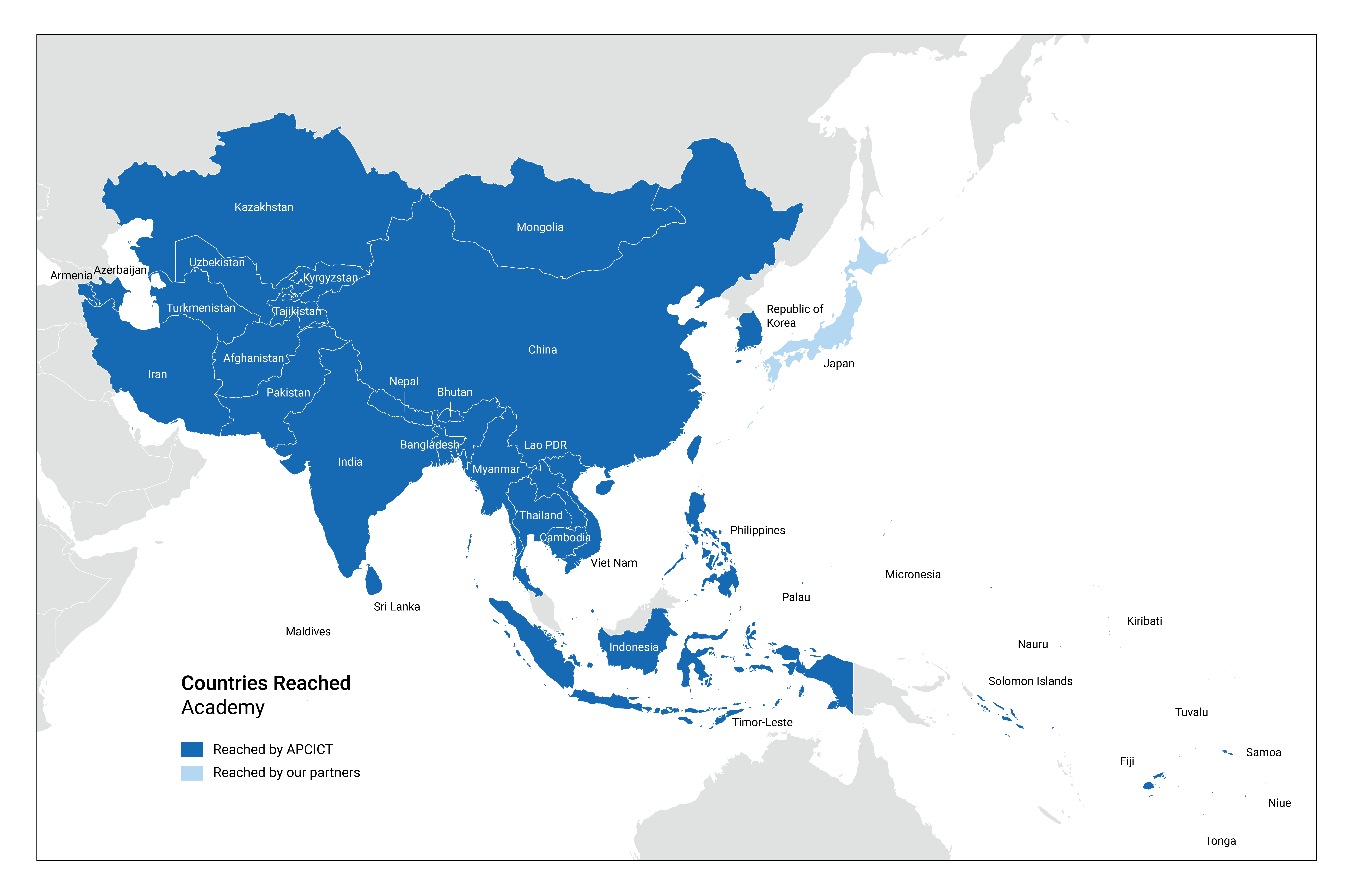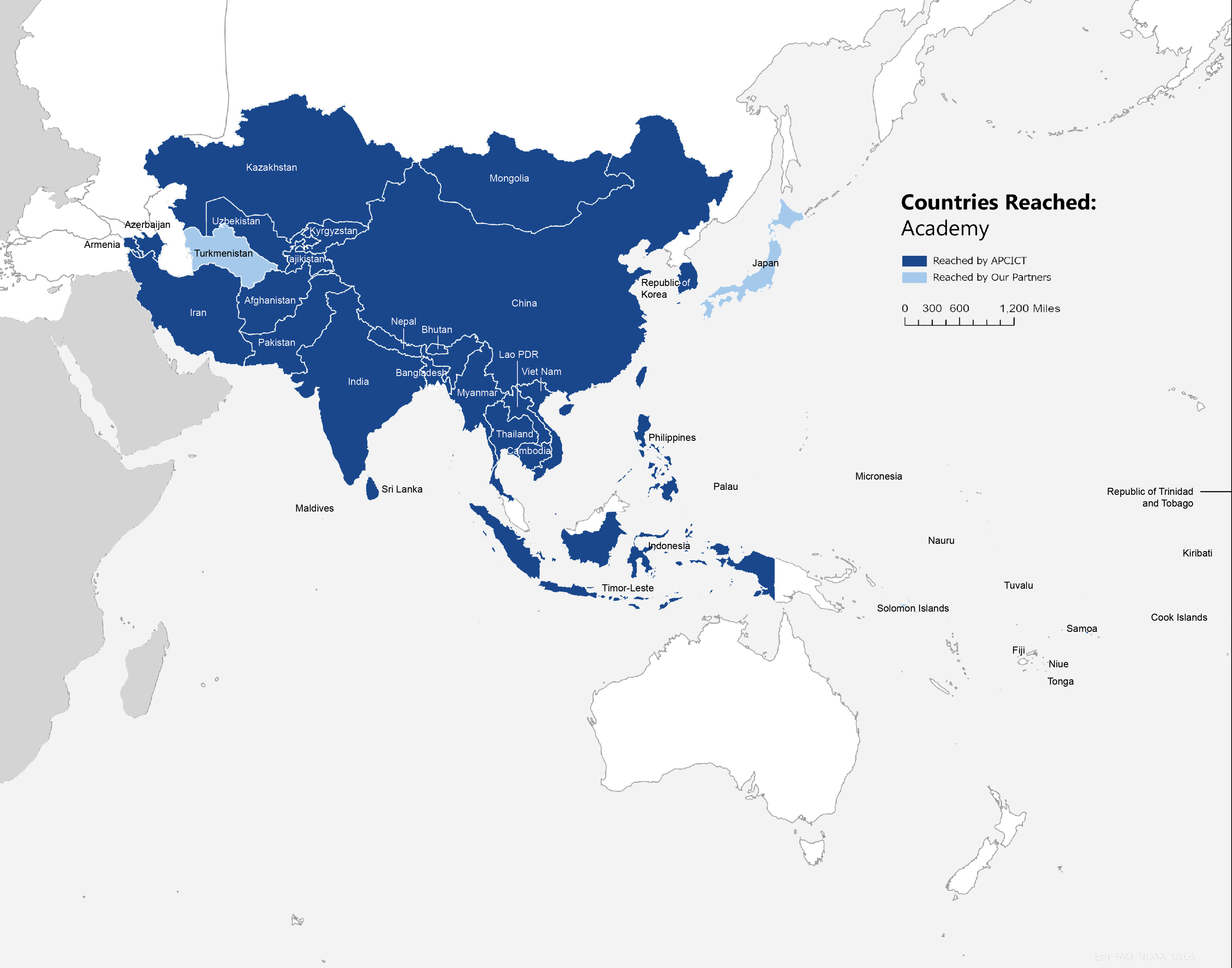 The Academy has been rolled-out in 40 countries throughout the Asia-Pacific region, including Afghanistan, Armenia, Azerbaijan, Bangladesh, Bhutan, Cambodia, China, Cook Islands, Fiji, India, Indonesia, Iran, Japan, Kazakhstan, Kiribati, Kyrgyzstan, Lao People’s Democratic Republic, Maldives, Micronesia (Federated States of), Mongolia, Myanmar, Nauru, Nepal, Niue, Pakistan, Palau, Philippines, Republic of Korea, Republic of Trinidad and Tobago, Samoa, Solomon Islands, Sri Lanka, Tajikistan, Thailand, Timor-Leste, Tonga, Turkmenistan, Tuvalu, Uzbekistan, and Viet Nam.